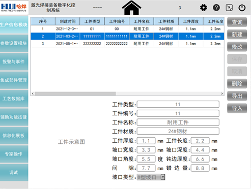 李榮團隊開發(fā)了一套激光焊接裝備數字化控制系統人機界面軟件,對于提升設備整體的穩(wěn)定性和信息化程度意義重大。該軟件基于QT平臺使用C++語言編寫,在工控機運行顯示,通過外接鍵盤來輸入參數,手動或者自動執(zhí)行焊接操作。具備生產信息、生產數據監(jiān)控、參數設置、歷史數據追溯及數據處理、報警及維護、監(jiān)控顯示、信息化看板等主要功能模塊。基于MYSQL建立工藝數據庫,工藝數據與工件信息和操作人員相匹配,實現信息的存儲、分類整理和統計分析,并能夠實現與上層企業(yè)信息管理系統的互聯互通,企業(yè)可隨時導出需要的生產數據,方便企業(yè)進行生產規(guī)劃、生產進度管理和產品質量追溯,推動企業(yè)向數字化工廠發(fā)展。