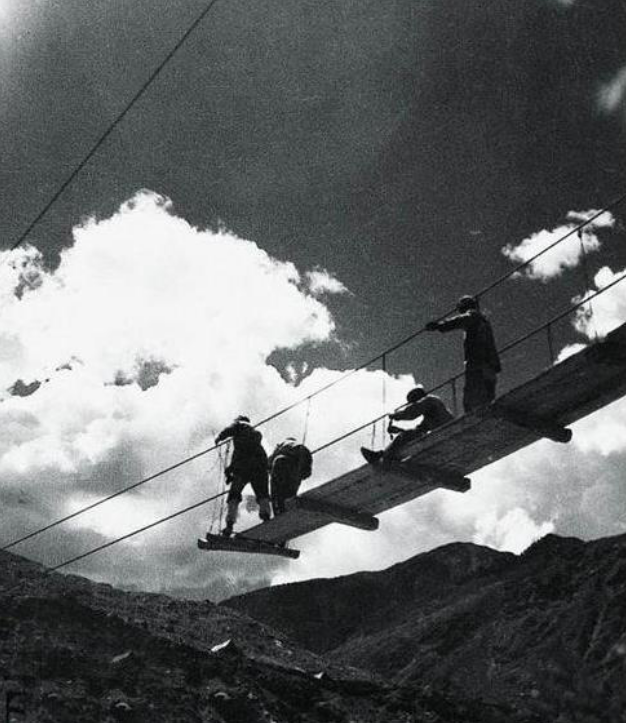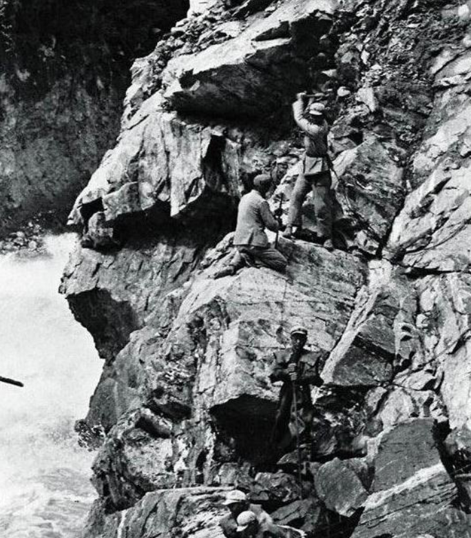 圖為在懸崖峭壁上打炮眼的解放軍戰士。