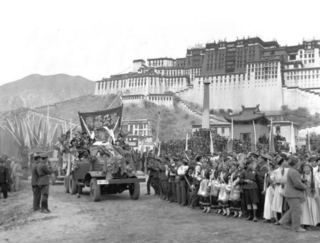 從青藏公路開到拉薩布達拉宮前的汽車隊,受到當地人民的夾道歡迎