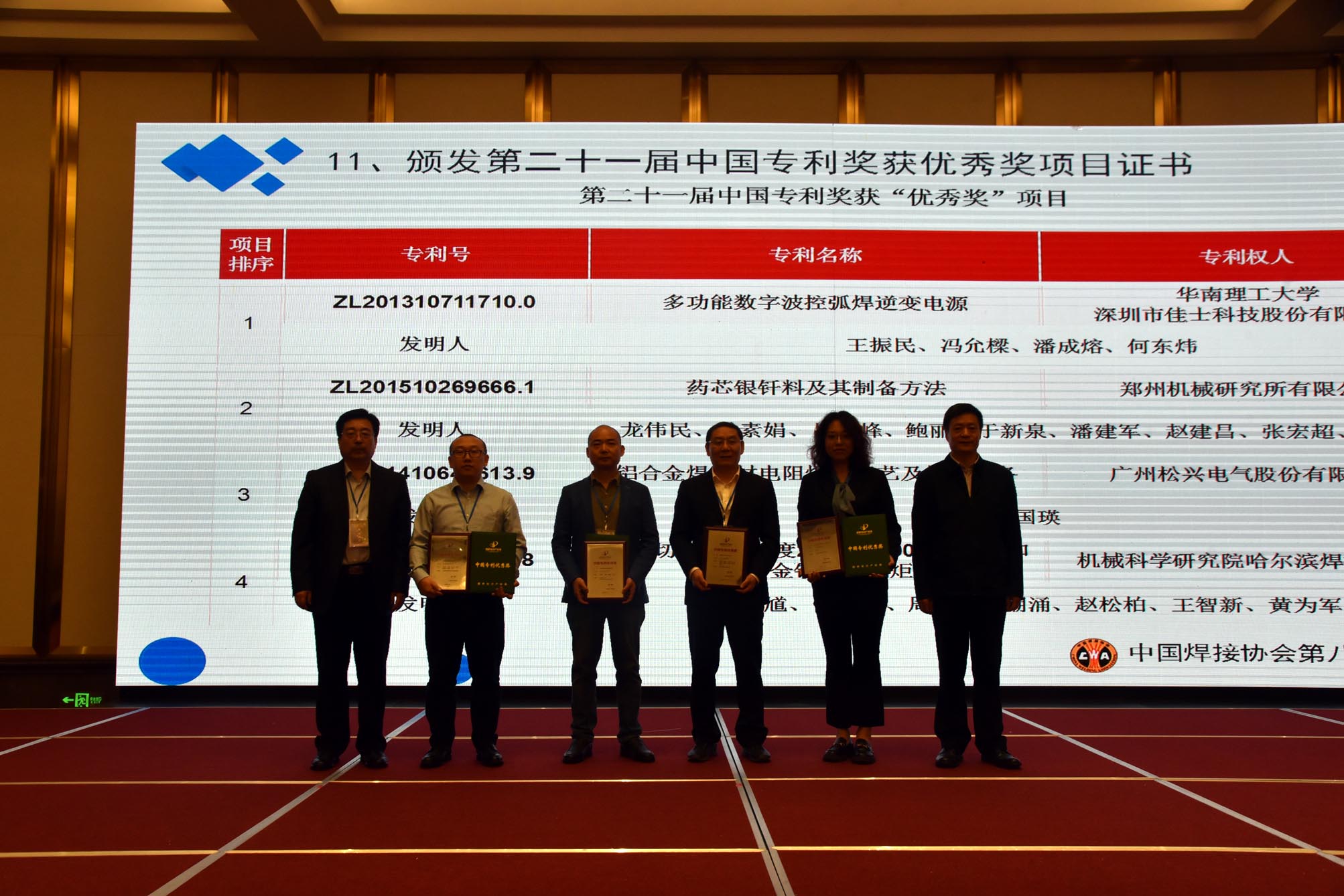 中國焊接協(xié)會會長俞培根、副會長楊玉亭分別為榮獲“第二十一屆中國專利優(yōu)秀獎”的深圳市佳士科技股份有限公司、鄭州機(jī)械研究所有限公司、廣州松興電氣股份有限公司、哈爾濱焊接研究院有限公司,頒發(fā)了第二十一屆中國專利獎獲優(yōu)秀獎項(xiàng)目證書。