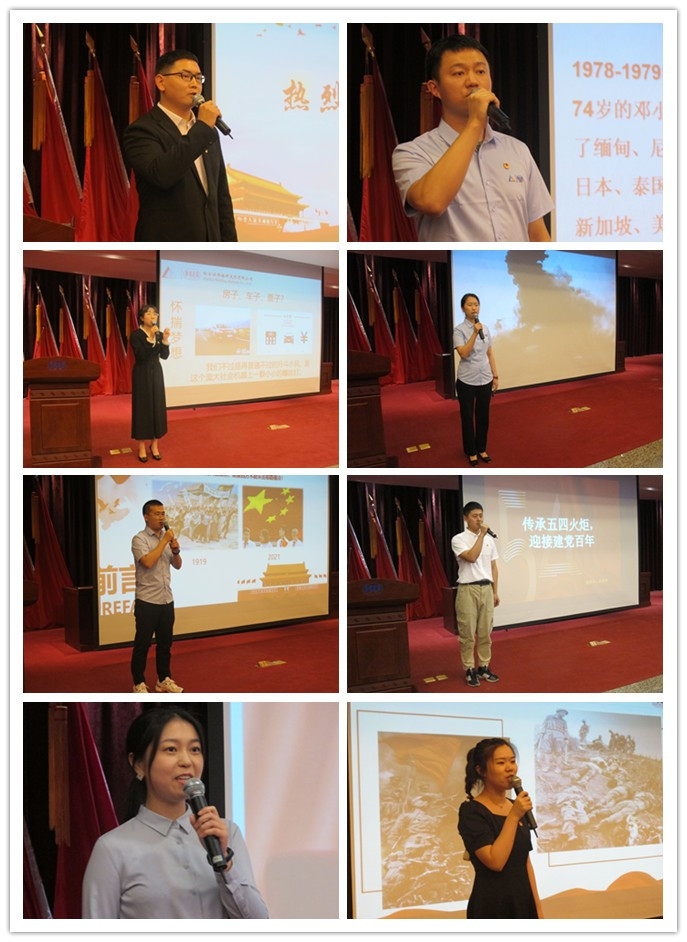 比賽伊始,一個簡約時尚的快閃視頻引燃開場,調起了現場觀眾的氣氛。來自五個團支部的八位選手陸續登臺展示,每位選手伴隨著自我展示的短視頻,精美的PPT和具有感染力的背景音樂,將個人的特點和獨特的風格發揮的淋漓盡致。大家分別以“五四運動,喚醒民眾”、“英雄母親鄧玉芬”、“偉大轉折開啟歷史新時期”等為主題,用生動的語言和感人的故事表達了對黨的無限熱愛和對英雄的敬仰之情。在演講過程中,每位選手都精神飽滿、感情充沛,他們富有感染力和吸引力的演講打動了評委和在場的觀眾,將現場氣氛推向一個又一個高潮。