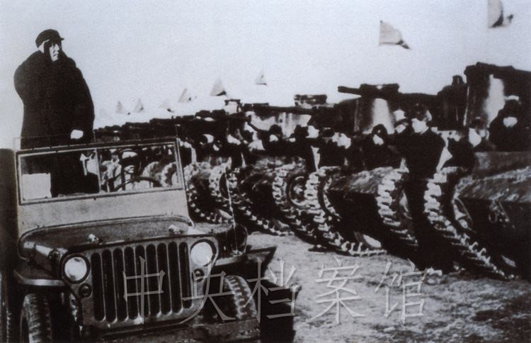紀錄片:(群眾呼聲)中國人民萬歲?。o錄片解說)檢閱開始了。東北野戰軍參謀長劉亞樓將軍,向毛主席報告受檢閱的部隊全部到齊。坦克塔上飄揚著紅旗,坦克手精神百倍,向著自己的領袖敬禮。